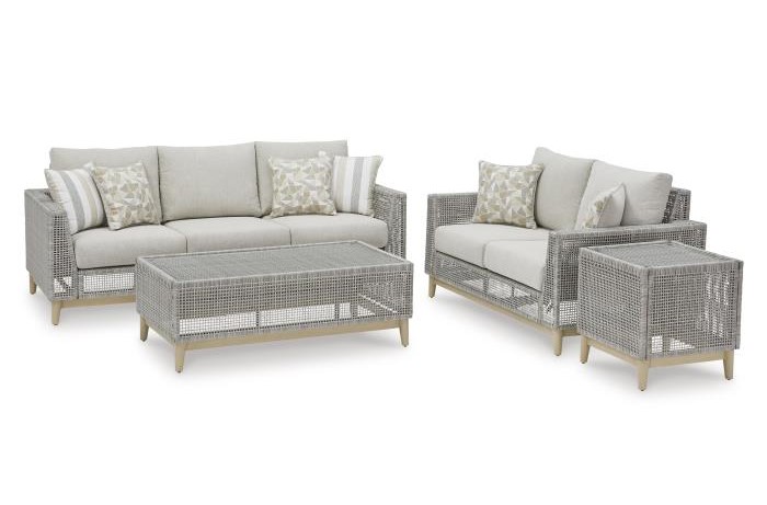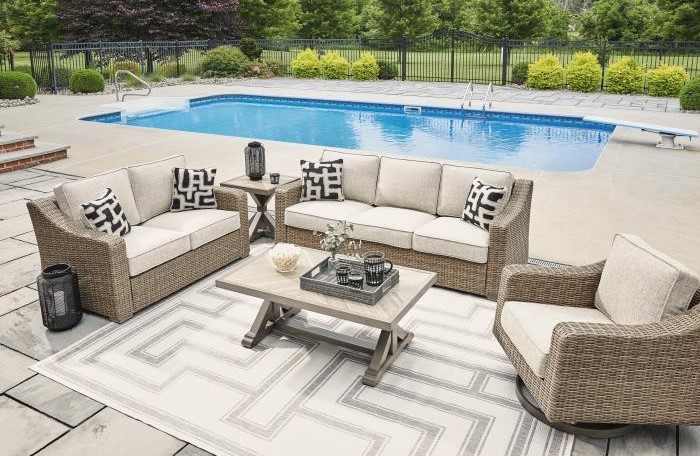 Want a beachy vibe without leaving home? The Beachcroft set delivers with a sofa, loveseat, two swivel chairs, and a cocktail table. Crafted with resin wicker and Nuvella+™ fabric, it's built to resist fading and weathering while looking effortlessly chic.